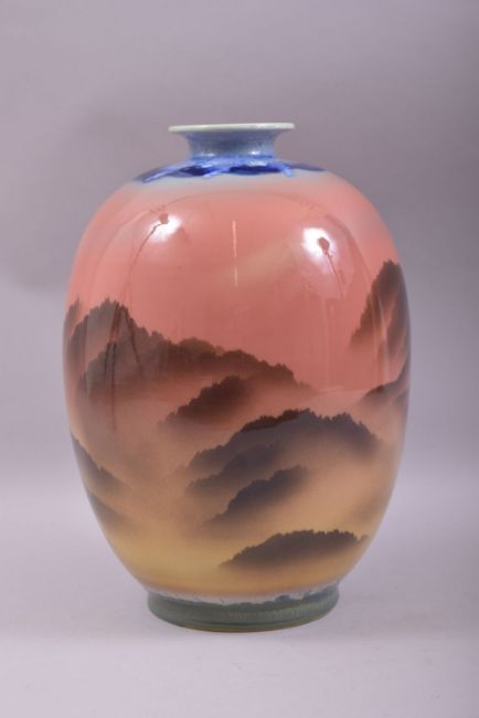 A LARGE JAPANESE PORCELAIN OVOID VASE, the body painted with an atmospheric sunset landscape, 33cm high.