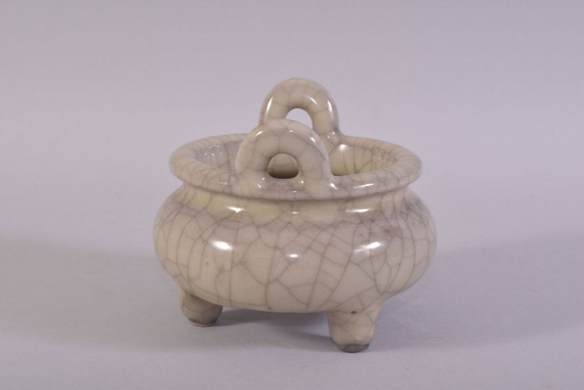 A CHINESE GE STYLE TWIN HANDLE TRIPOD CENSER, 13cm diameter.