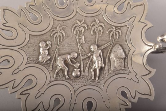 TWO INDIAN KUTCH SILVER LEAF FORM DISHES, the centre of each with embossed and finely chased scenes; one of a figure riding a horse with other animals, the other depicting figures working, the handle on each curving into the form of a tigers head, both 18cm long (2).