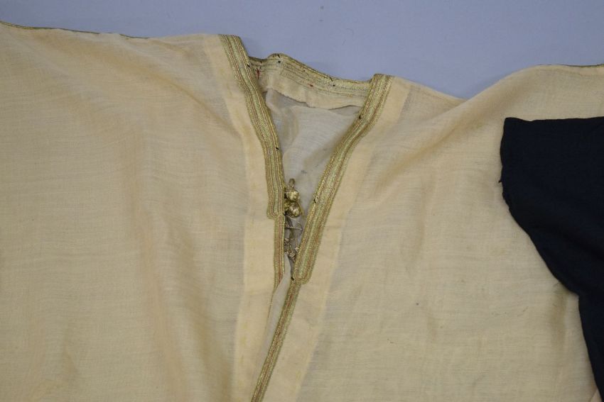 TWO COTTON ARAB ROBES, each gold coloured braiding, together with a woven headband.