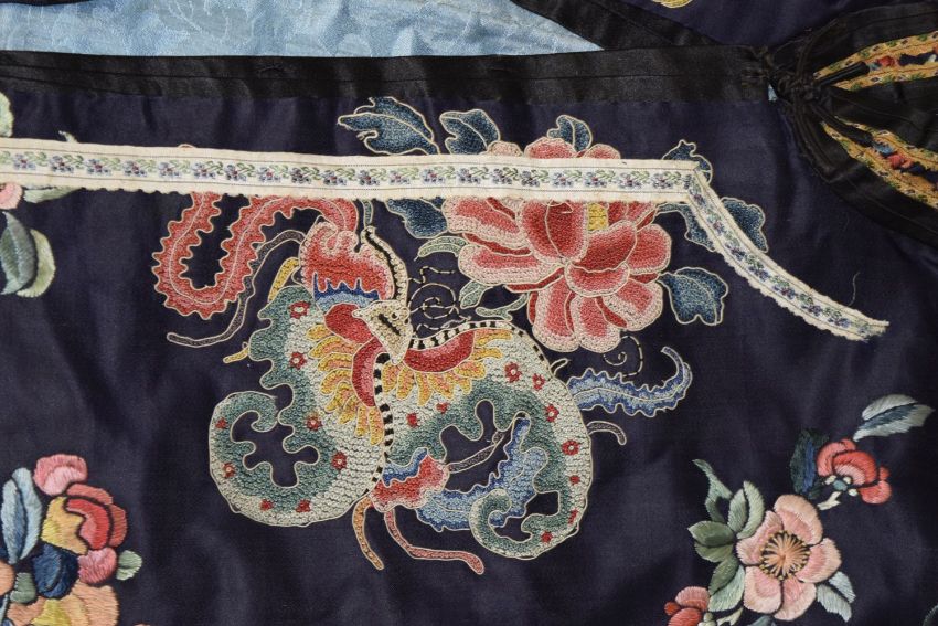A VERY GOOD QUALITY CHINESE EMBROIDERED BLUE SILK KIMONO, embroidered with bats, fruit and flowers.
