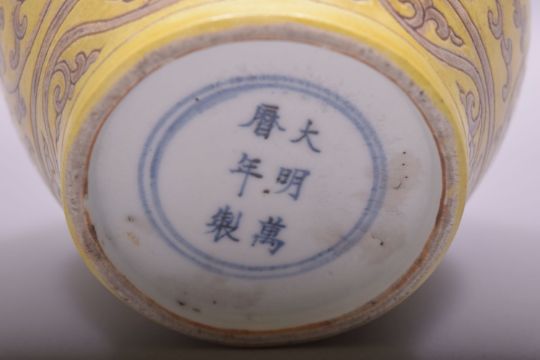 A CHINESE MING STYLE YELLOW GROUND PORCELAIN VASE, decorated with vine and stylised flower heads, six character mark to base, 13cm high.