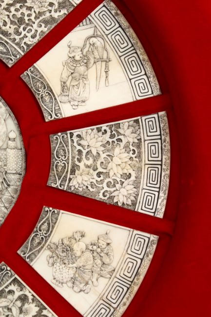 A FINE QUALITY JAPANESE MEIJI PERIOD CARVED IVORY FRAMED SECTIONS OF GODS AND CHILDREN, the mount housing 11 carved ivory panels, each panel carved with a varying native scene of children playing with animals, arranging ikebana, warriors with a parrot and spacing panels of flora and insects, the central panel depicting some of the seven lucky gods of japan including hotei, kwannon and ebisu, surrounded with children and other figures, framed 53cm diameter, the central panel 16cm.
