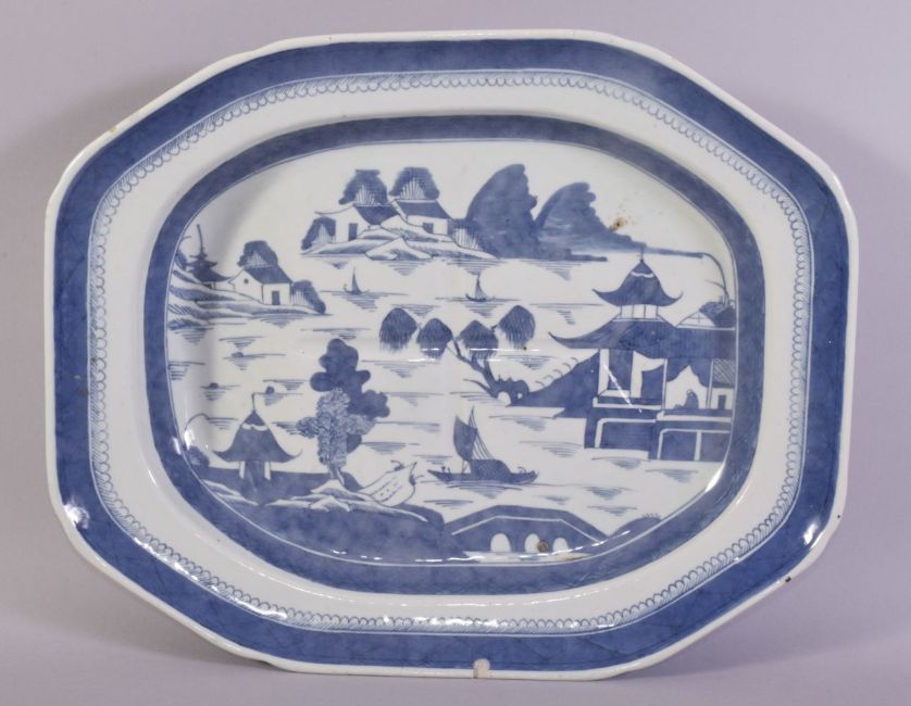 A CHINESE BLUE AND WHITE PORCELAIN CARVING DISH, decorated with landscape scene, the centre with fluted draining tree and well, 39cm x 31.5cm.