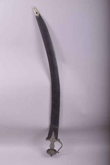 A SUPERB INDIAN SILVER INLAID STEEL HILT TULWAR and leather scabbard, 91cm long.