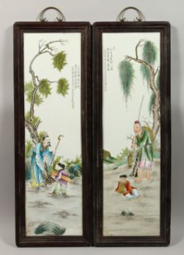A PAIR OF FRAMED CHINESE PORCELAIN LONG TILES, 28ins x 80ins