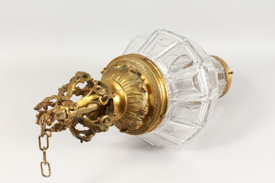 A GOOD 19TH CENTURY GILT METAL AND GLASS HANGING LIGHT.