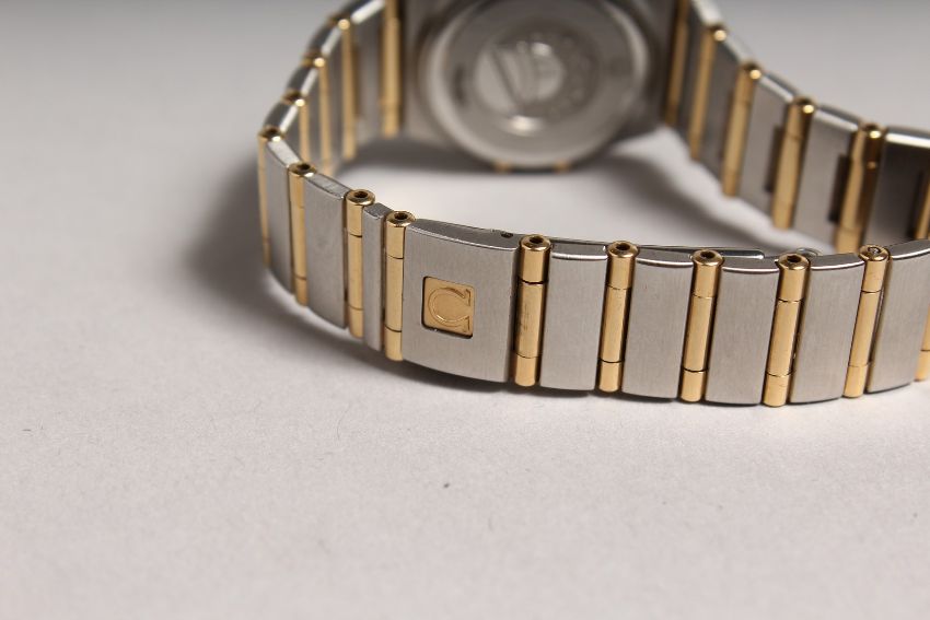 A LADIES OMEGA CONSTELLATION STAINLESS STEEL AND 18CT GOLD WRISTWATCH AND BRACELET, CODE 17330279, with paperwork and boxes.