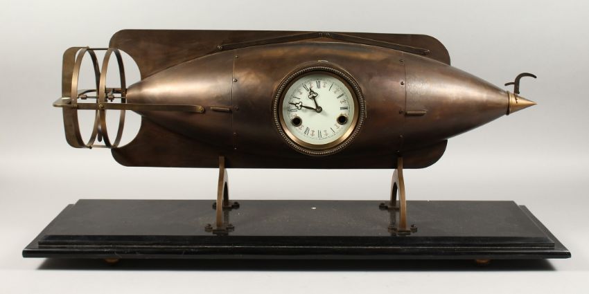 A GOOD BRONZE TORPEDO SHAPED CLOCK, with circular dial on a marble base. 30ins long.