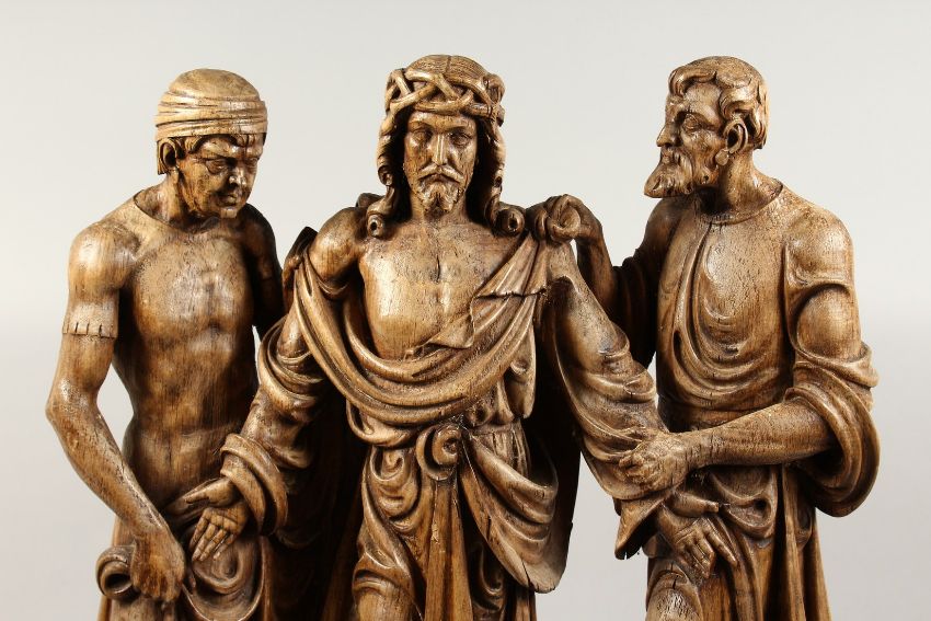 A SUPERB 18TH CENTURY GERMAN CARVED LIMEWOOD GROUP, CHRIST with two men, the base with a cross and three dice. 28ins high x 24ins wide.