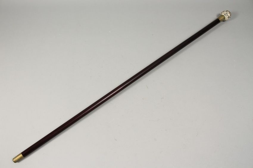 A CARVED BONE HANDLED WALKING STICK, with globe compass,. 37ins long.