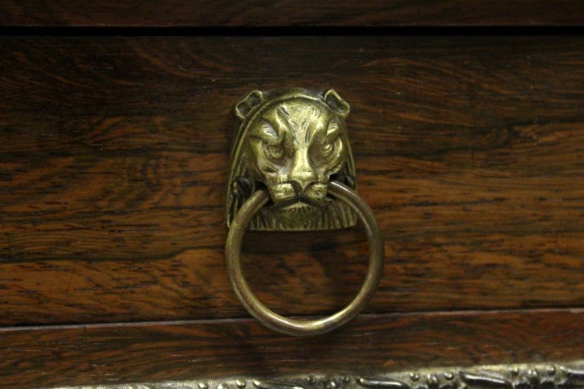 A REGENCY ROSEWOOD SOFA TABLE, of rounded rectangular form, with two frieze drawers, two drawers verso, on plain supports with curving legs and brass castors.