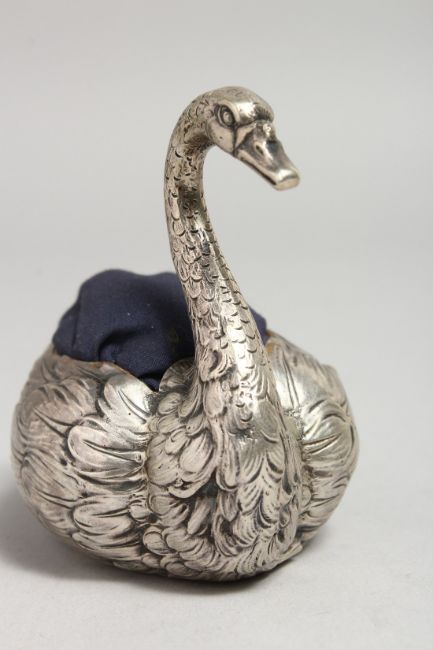 A CONTINENTAL SILVER .800 SWAN PIN CUSHION. 3.5ins