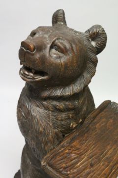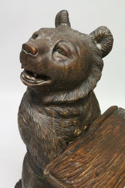 A VERY GOOD 19TH CENTURY BLACK FOREST CARVED WOOD BEAR holding a tray, 3ft 3ins high, it's head to one side.