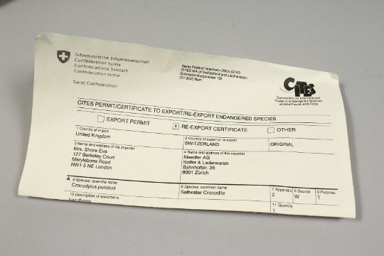 MADLER, A SALTWATER CROCODILE BAG, 14ins, with export documents.