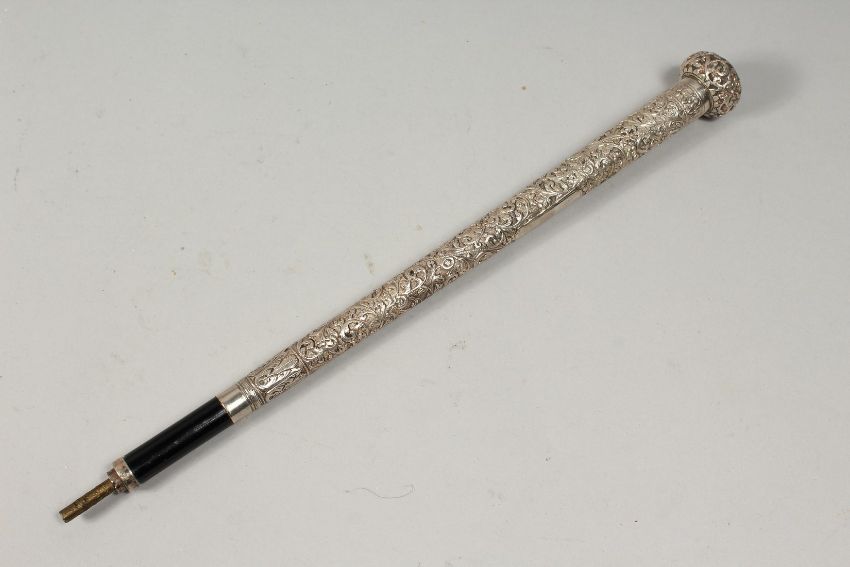 A BURMESE SILVER HANDLED CANE. 15ins long.