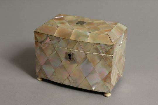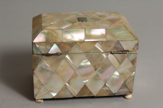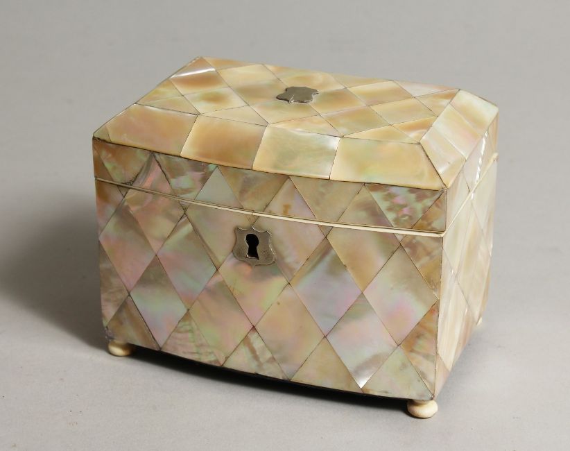 A REGENCY MOTHER OF PEARL BOW FRONTED TWO DIVISION TEA CADDY. 8ins long.
