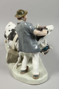 A VERY GOOD LARGE MEISSEN GROUP, FARMER AND TWO COWS.