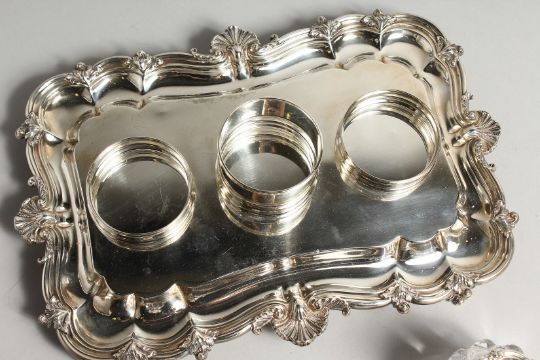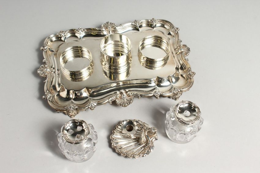 A SUPERB WILLIAM IV SILVER INKWELL with two silver glass bottles and shell shaped chamber stick.