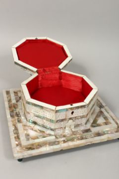 A FINE MOTHER OF PEARL ISLAMIC TEMPLE with calligraphy, the top opening to reveal a red velvet interior. 9.5ins square, 8 ins high.
