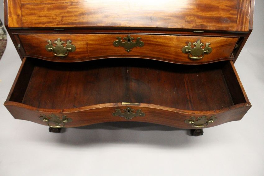A SUPERB 18TH CENTURY AMERICAN, BOSTON, MAHOGANY, BUREAU BOOKCASE, the top with shaped cornice over double panel doors, the bureau base with folding 'flap opening' to reveal a fitted interior with small drawers and pigeon holes over four legs, shaped graduated drawers wit brass handles and supported on claw and ball feet.
