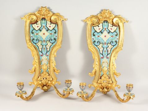 A SUPERB PAIR OF FRENCH, ORMOLU AND ENAMEL TWO LIGHT WALL SCONCES WITH ACANTHUS AND SCROLLS
