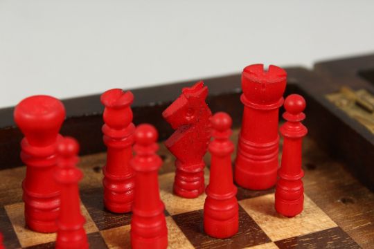 A SMALL COLUMD IVORY TRAVELLING CHESS SE with folding case board. 5.75ins.