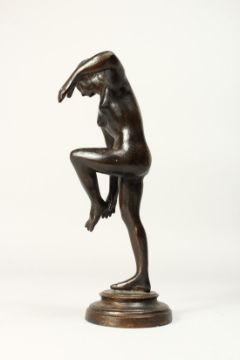 A BRONZE FIGURE OF A STANDING NUDE on one leg, on a circular base.