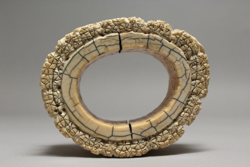 A MANMOUTH CARVED BONE OVAL DISC carved with deer and tiger.