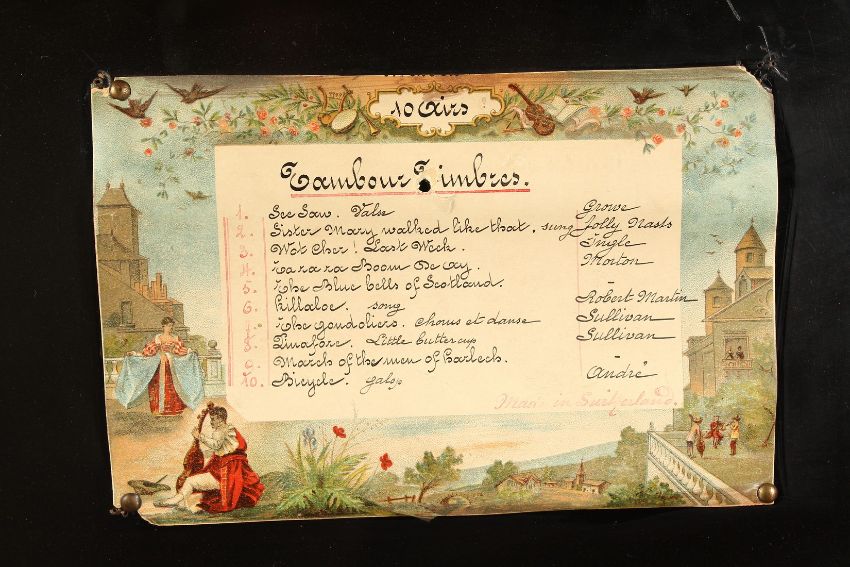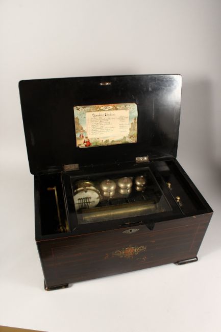 A 19TH CENTURY SWISS MUSICAL BOX playing 10 airs with drums and six bells, in an inlaid rosewood case.