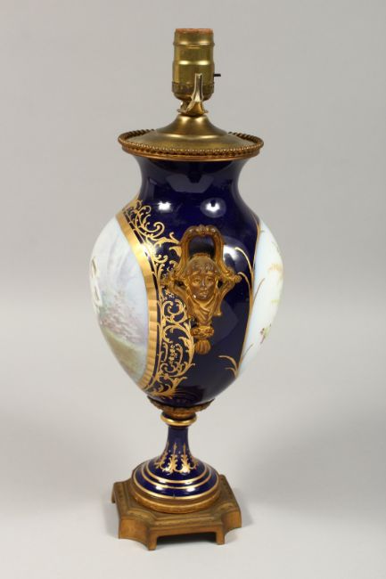 A 19TH CENTURY SEVERES PORCELAIN VASE with ormolu mounts, painted with reverse scenes, flowers and cupid. 18ins high.