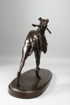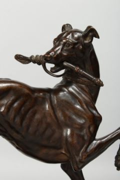 A SUPERB BRONZE GREYHOUND carrying a riding crop in it's mouth, 12ins high, 14ins long.