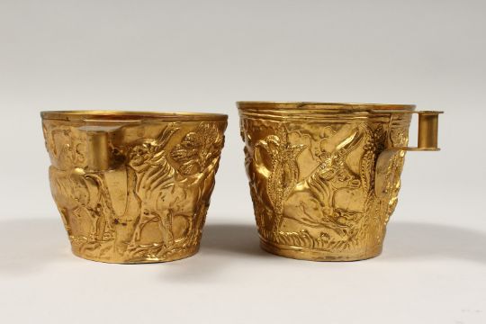 A PAIR OF GREEK TWO HANDLED GILT CUPS. 4ins diameter.