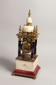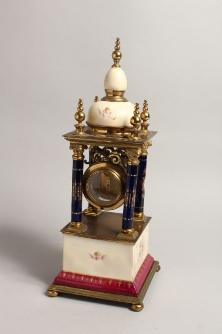 A SUPERB 19TH CENTURY VIENNA SQUARE SHAPED COLUMN CLOCK, with porcelain panels painted with cupids with blue column, domed top on ball feet.