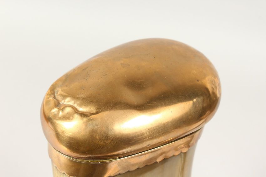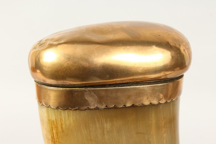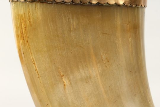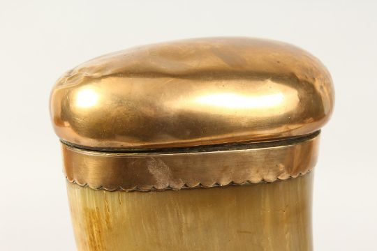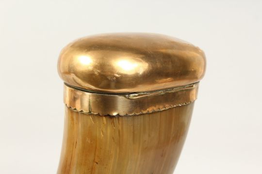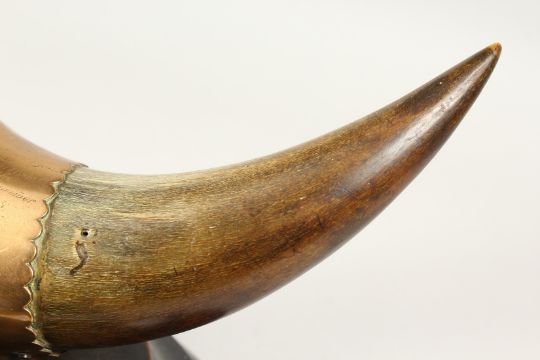 A VERY GOOD LARGE HORN TABLE SNUFF MULL, the curving form 18ins long with brass top and brass plaque engraved 'Congratulations from the oldest member W. Fletcher, Elmas, 1913', standing on an oval wooden base.