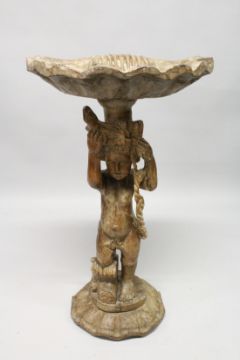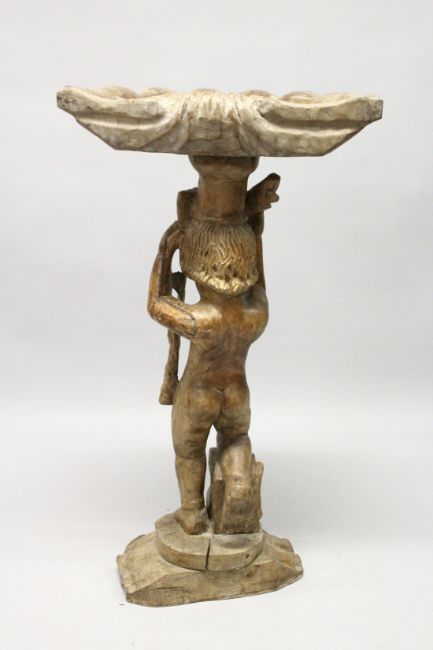 A LARGE CARVED WOOD SHELL AND CUPID STAND, 3ft 6ins long.