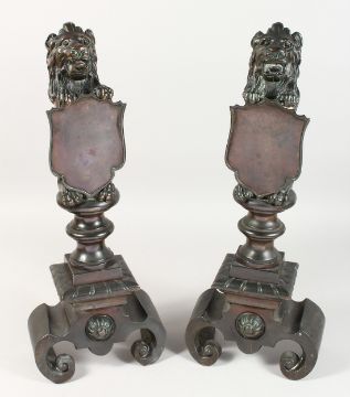 A SUPERB PAIR OF 19TH CENTURY BRONZE ANDIRONS with lion holding shields on curving feet.