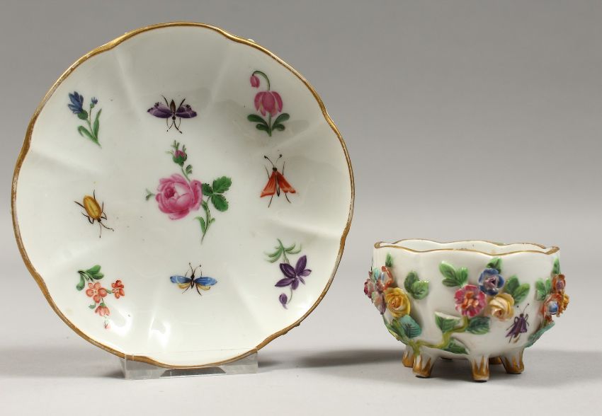 A SMALL MEISSEN FLOWER ENCRUSTED CUP AND SAUCER, painted with butterflies.