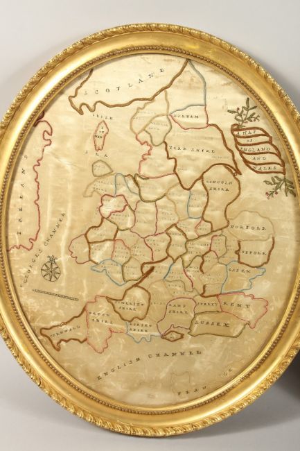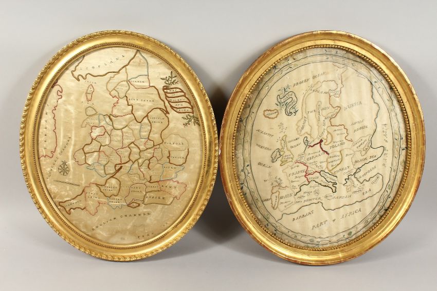 A RARE PAIR OF GEORGE III SILKWORK MAPS OF GREAT BRIATAIN AND EUROPE and beyond, in an oval gilt frames.