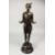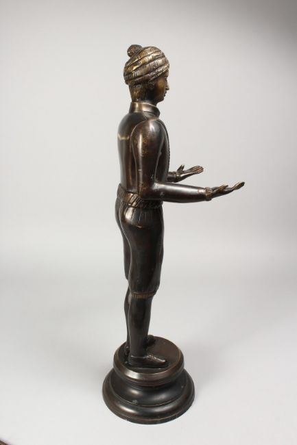 A CAST BRONZE FIGURE OF A STANDING MALE, his arms outstretched, holding a tray, on a circular base.