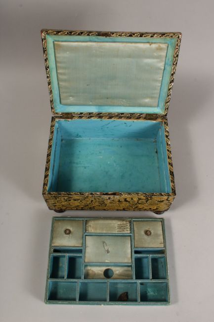 A REGENCY POKERWORK JEWELLERY BOX with fitted interior on four bun feet.