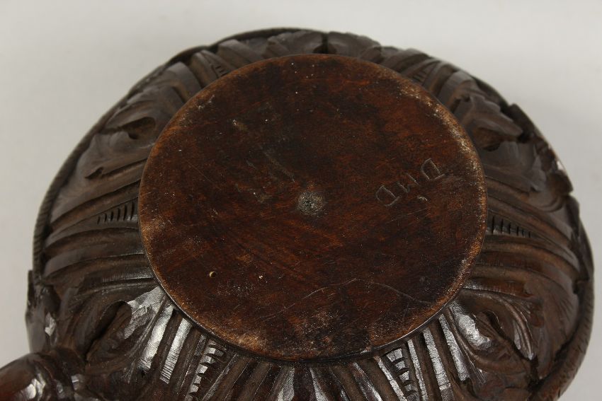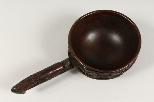 A LARGE AMERICAN CARVED WOOD SCOOP. the sides carved with snakes with American eagle handles. 7ins high x 14 ins long.