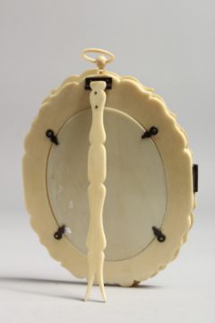 AN EDWARDIAN OVAL PORTRAIT MINIATURE OF A YOUNG LADY, bust length, housed in a pierced ivory strutt frame with bi-fold front.