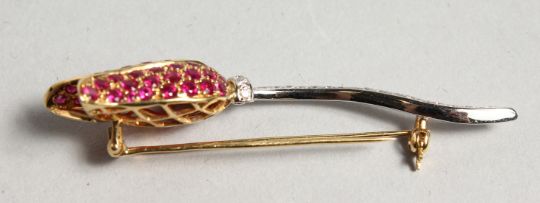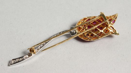 AN 18CT WHITE AND YELLOW GOLD TULIP BROOCH set with rubies and diamonds.