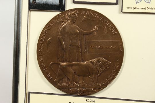 82706. Private George Sharp, 57th Bn; Machine Gun Corps (Infantry) D.O.W. 3rd October 1918, Boisleux-St. Marc, France, Age 20. Framed and glazed with Machine Gun Corps Cap Badge and a photograph of Pte. Sharp's headstone.