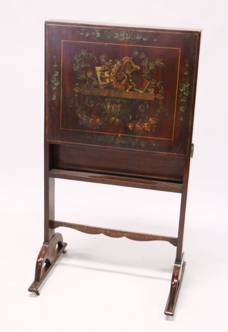 AN 18TH CENTURY SHERATON DESIGN MAHOGANY WRITING DESK with folding flaps, painted with flowers and cupids, opening to reveal recess and cupboard, on a stand.