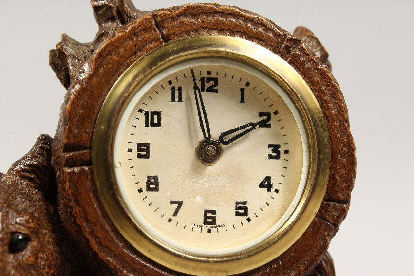 A GOOD VICTORIAN CARVED BLACK/ ONYX BEAR CLOCK. 7ins high.