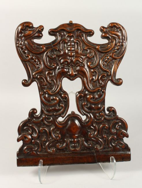 A GOOD SGABELLO CARVED WOOD PANEL. 16ins x 13ins.