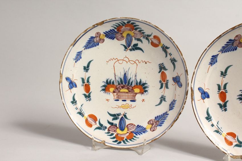 A PAIR OF 18TH CENTURY DUTCH DELFT TIN GLAZED PLATES with coloured enamels.