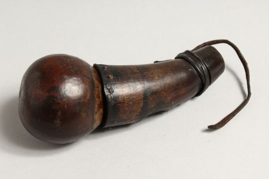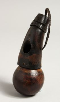 A TRIBAL WOODEN SNUFF BOTTLE OR POWDER FLASK. 5.25ins long.